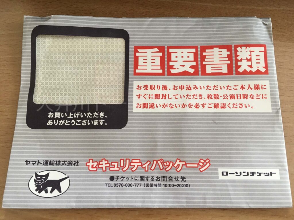 チケットが配達されたのは、約1ヶ月くらい前の5/23前後でしたね。ヤマト運輸のセキュリティーパッケージで届きましたよ。
