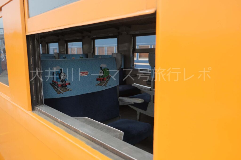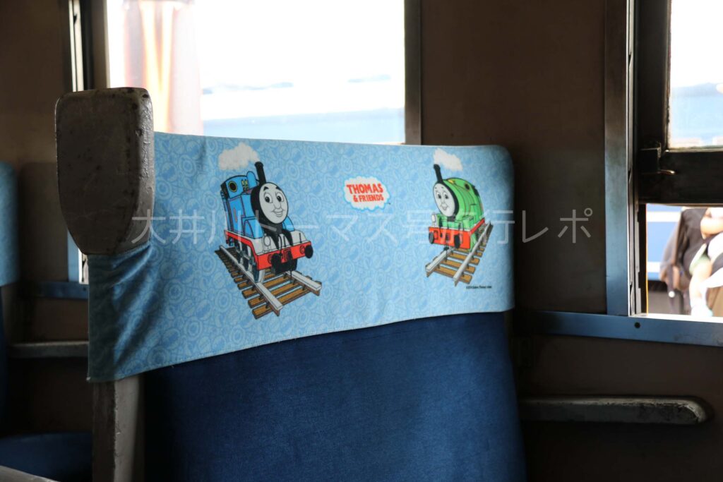 車内の椅子にはトーマスとパーシーの絵が入ったカバーがかけられています